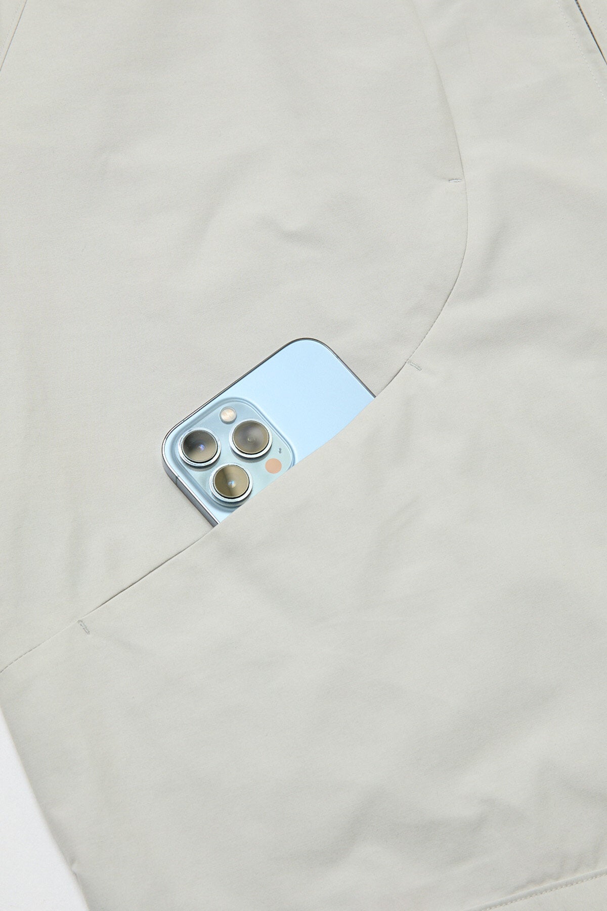 Eines der markantesten Merkmale der Jacke sind die einzigartig konstruierten Fronttaschen, die den natürlichen Linien der Vorderseite folgen und von einem Verschluss auf Brusthöhe in offene Einschubtaschen darunter übergehen – eine kühne Verschmelzung von Form und Funktion.