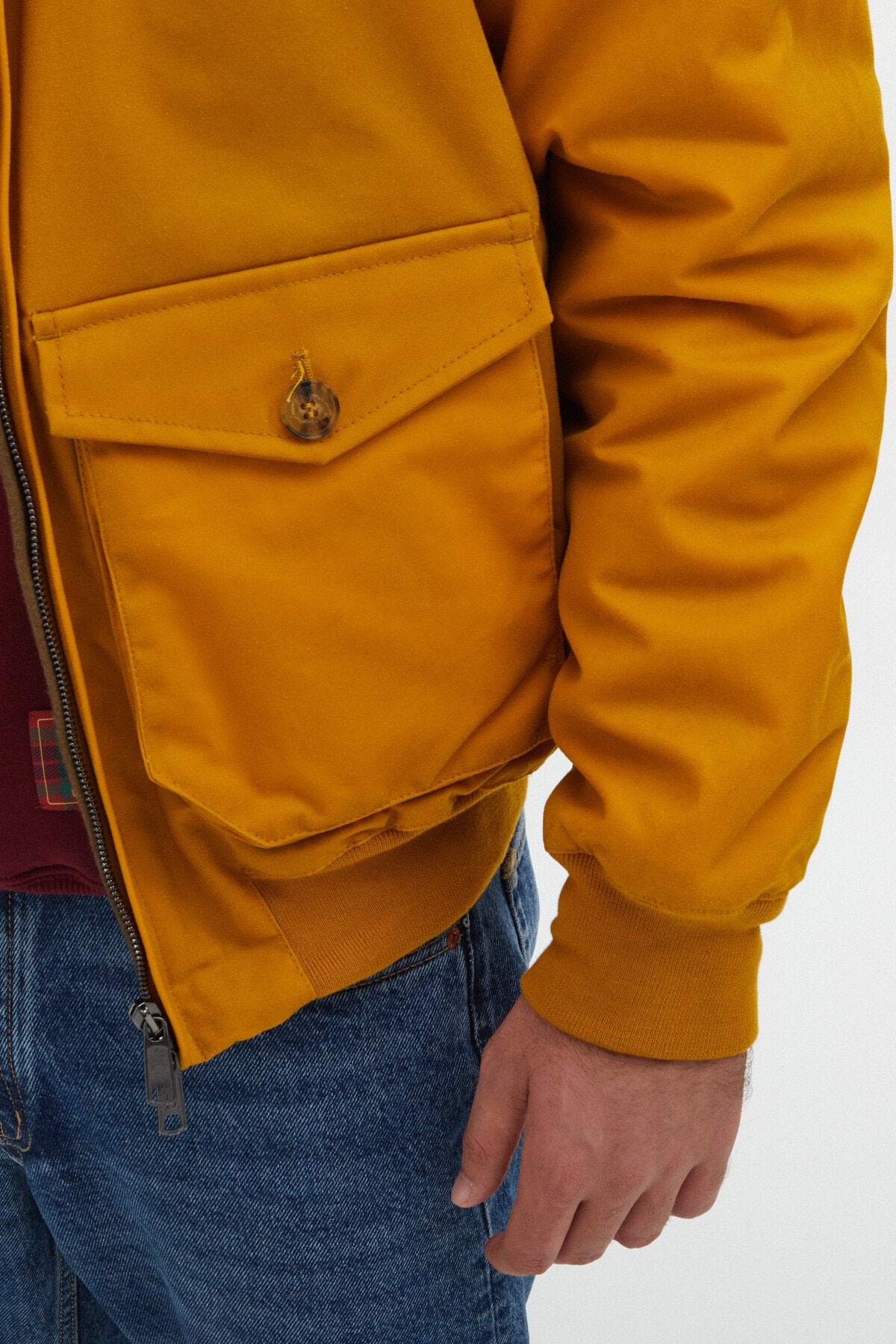• Mit unserer G9 Jacke aus gewachster Baumwolle von British Millerain mit Taschen, dem ursprünglichen Hersteller dieses Stoffes seit 1880, sind Sie für nasses und windiges Wetter gerüstet. Die Authentic Fit-Jacke ist weiter und entspannter als die Regular Fit-Jacke, die Sie in unserm klassischen G9 Harrington finden. Die Jacke hat eine leichte Änderung der traditionellen G9-Merkmale: Anstelle der charakteristischen schrägen Seitentaschen haben wir zwei größere Taschen in der Mitte der Jacke angebracht. Zu den weiteren Merkmalen des G9 gehören der kultige Schirmrücken und der klassische Eselsohr-Kragen mit zwei Knöpfen. Tragen Sie ihn mit unserem gewachsten Bucket Hat für maximalen Schutz vor Regen!