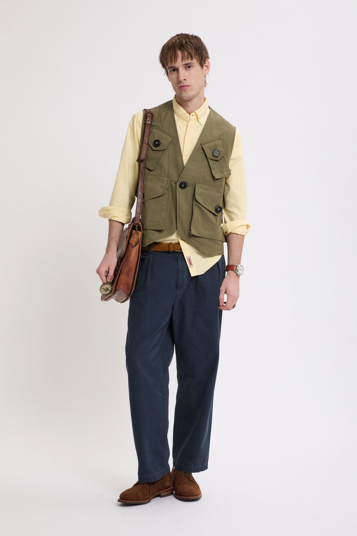 Die Sailing Cargo Vest besteht aus 100% Baumwollpopeline – einem leichten, festen Gewebe, das für seine glatte Oberfläche und seinen strukturierten Fall geschätzt wird. Popeline behält in jeder Falte ihre Form und verleiht der Weste ein sauberes, fast maßgeschneidertes Erscheinungsbild, ohne die Bewegungsfreiheit einzuschränken. Mit funktionalen Details gestaltet, verfügt das Modell über zwei rechteckige Brusttaschen sowie großzügige aufgesetzte Taschen mit Patten und Knopfverschluss. Diese Weste lässt sich ideal über Hemden, T‑Shirts oder Strickwaren tragen.